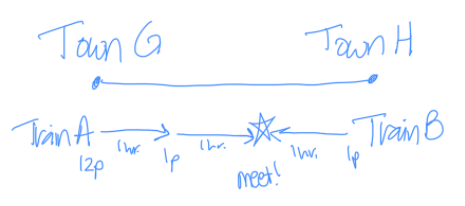 Consider drawing out what's happening, so you can visualize it. First, Train A starts at Town H and travels alone for an hour towards Town G. Let's say Train A starts at noon.
