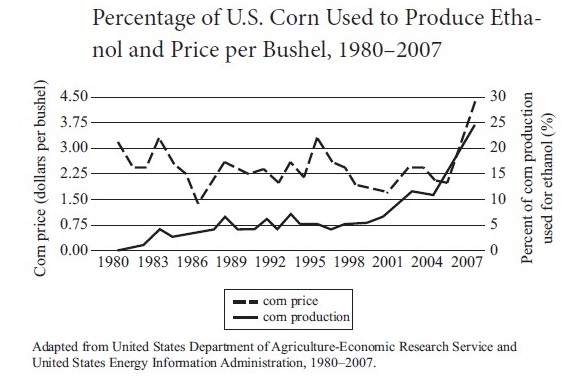 Ethanol is created from plants such as corn, sugarcane, soybeans, and rice. While ethanol is a viable energy source, very large areas of cropland must be dedicated to growing these plants in order to produce enough ethanol to be designated for commercial use. This production raised ethical questions because it meant farmers were growing food sources earmarked solely for fuel when there were many people around the world in dire need of food. These concerns only increased after 1995, as ______
